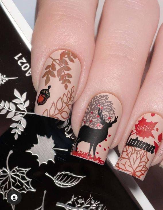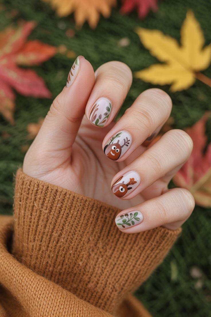 Neutral nude nails accented with leafy greens and adorable reindeer art add a cozy, storybook touch, making it an ideal November design.