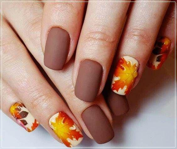 Rich brown matte nails combined with fiery orange and yellow maple leaves, capturing the warm essence of crisp November days.