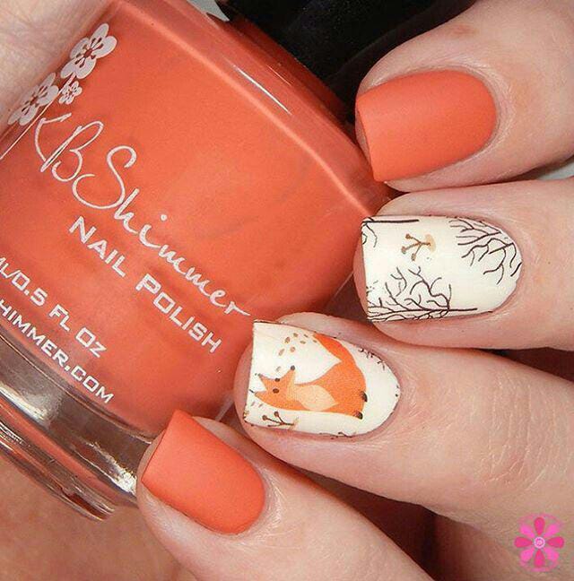 Bold burnt-orange matte nails are paired with accent nails showcasing a curled fox surrounded by bare tree branches. The look blends earthy tones with cute woodland charm, ideal for cozy November days.