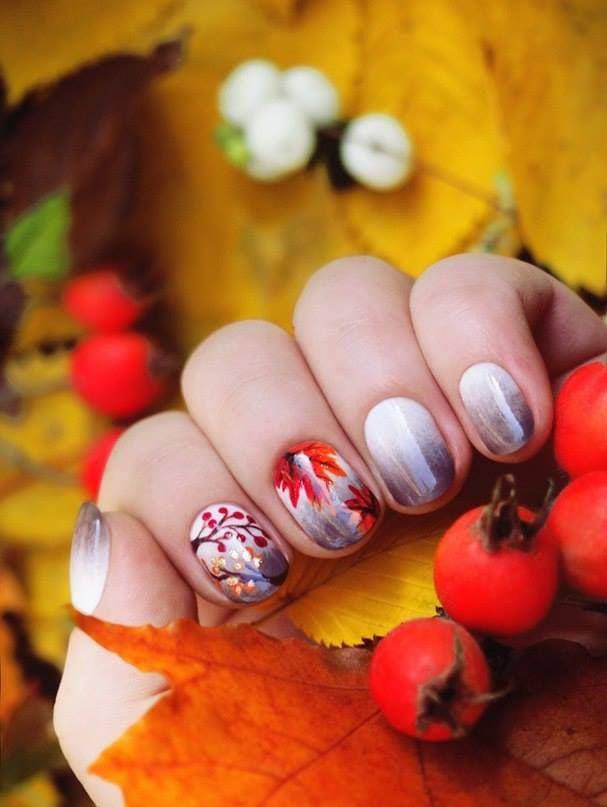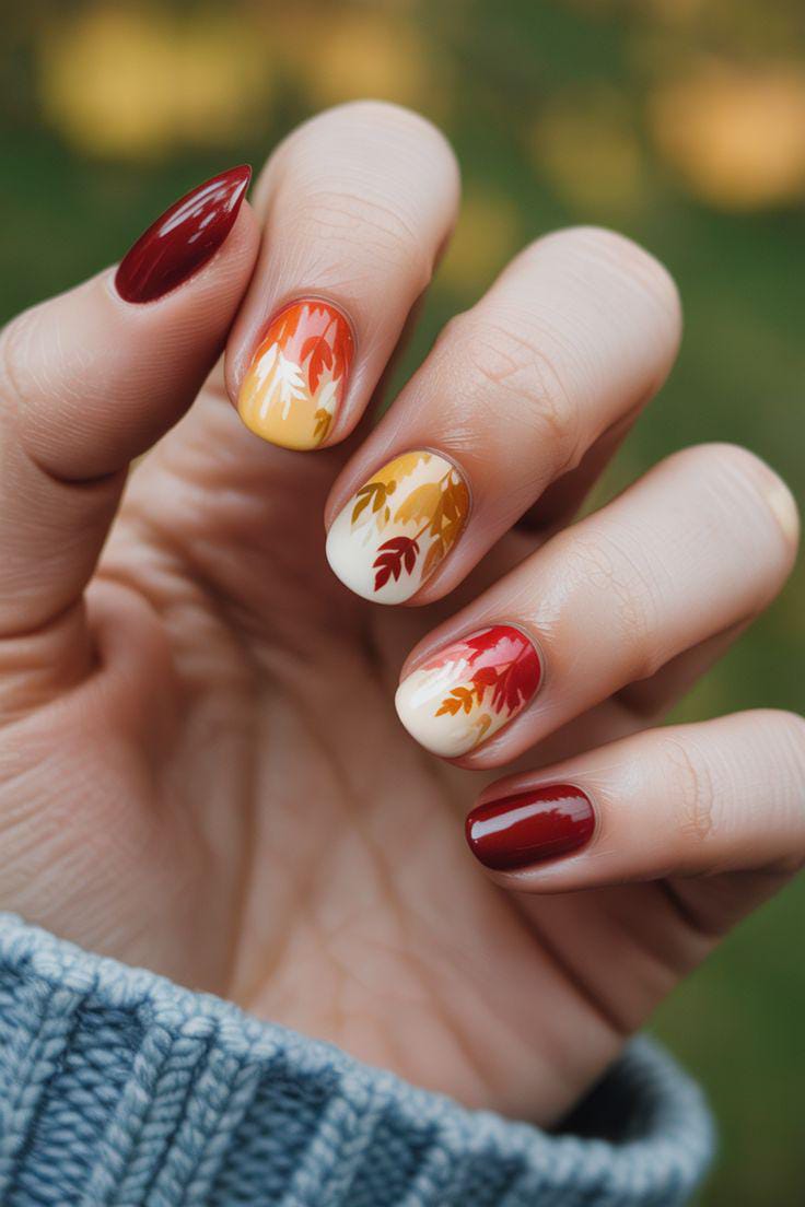 Warm autumn leaves in rustic reds, oranges, and browns scatter across a neutral base, giving a delicate and seasonal feel. The design feels like carrying a little piece of the November landscape on your nails.