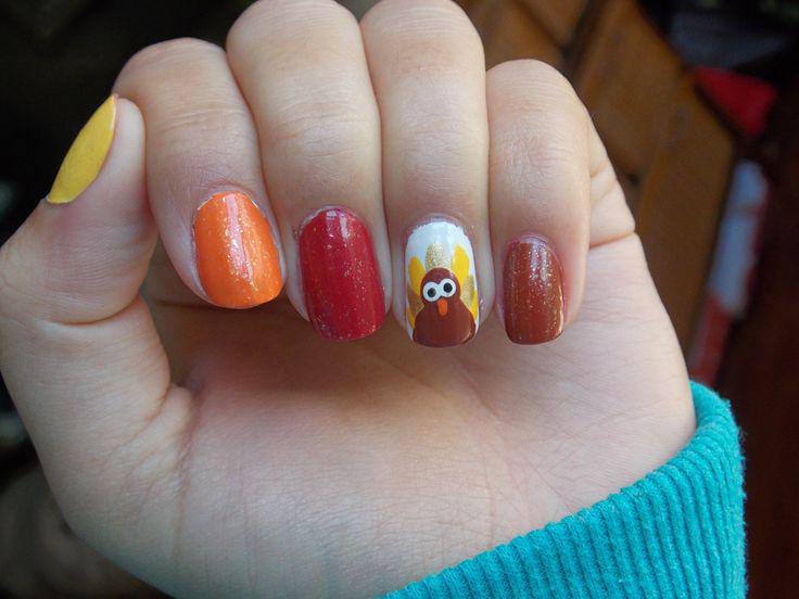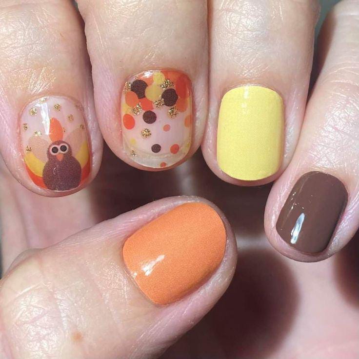 A playful Thanksgiving design featuring a cute turkey, confetti dots, and a mix of brown, yellow, and orange nails captures the festive, joyful spirit of November.