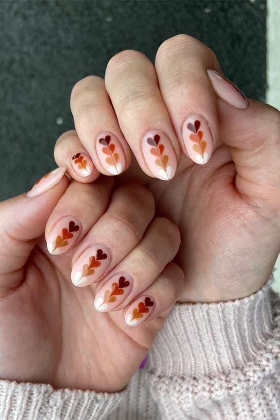 This design showcases cascading hearts in warm autumn shades of red, orange, and brown over a nude base, resembling falling leaves. It’s a simple yet classy way to carry the spirit of November right at your fingertips.