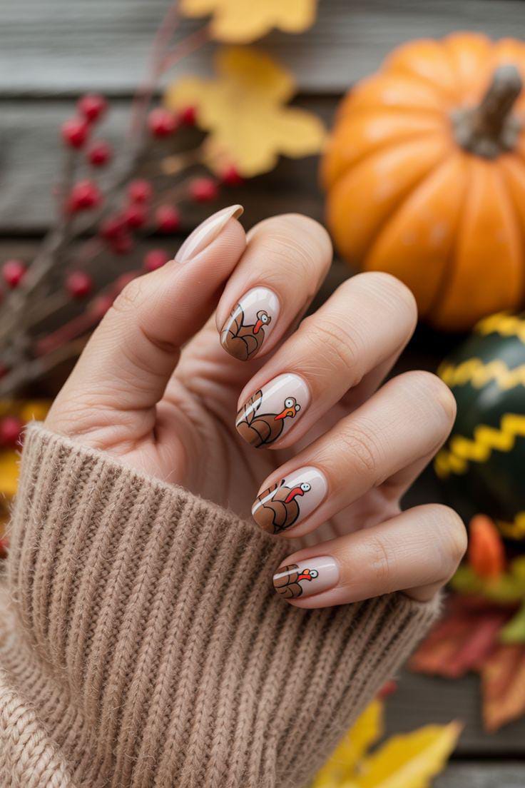 A playful Thanksgiving-inspired look, these nails feature cute cartoon turkeys painted over a soft neutral polish. The design is festive but still classy, making it the perfect pick for holiday gatherings without feeling over the top.