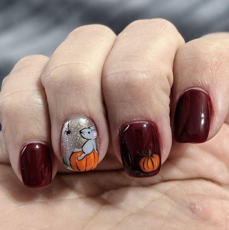 Deep burgundy nails are highlighted with a sparkling silver accent nail featuring a mouse perched on a pumpkin. The combination of rich dark tones, shimmer, and whimsical art feels festive and warm for the season.