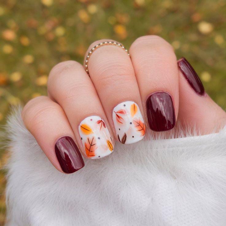 Deep burgundy nails paired with two white accent nails featuring delicate orange and brown leaves create a warm, cozy autumn vibe perfect for November.