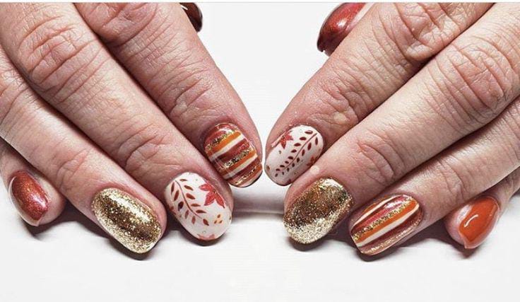 Rich copper, glittery gold, and white nails with striped and leaf patterns come together for a festive, sparkling fall-inspired manicure.