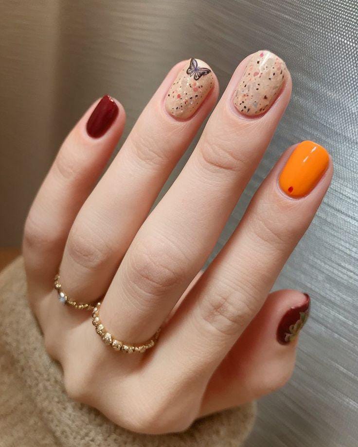 A warm mix of burgundy, pumpkin orange, and golden-speckled nude nails with a tiny butterfly charm offers a chic balance of classy and playful fall tones.