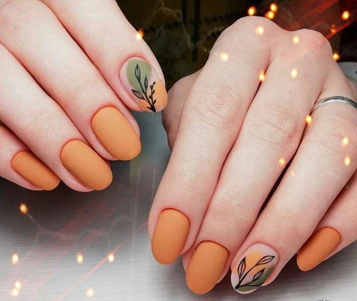 Matte pumpkin-orange nails paired with leafy accent details on a nude base bring a cozy, minimal, and stylish fall charm.
