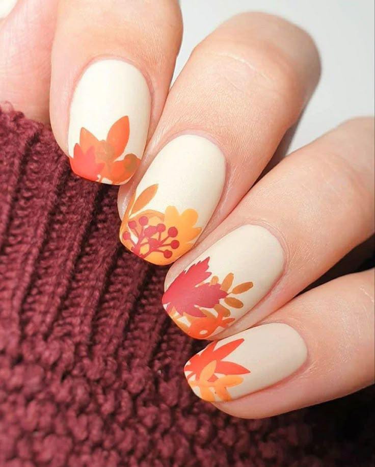 Soft matte beige nails tipped with burnt orange and golden leafy accents create a delicate, classy November look.
