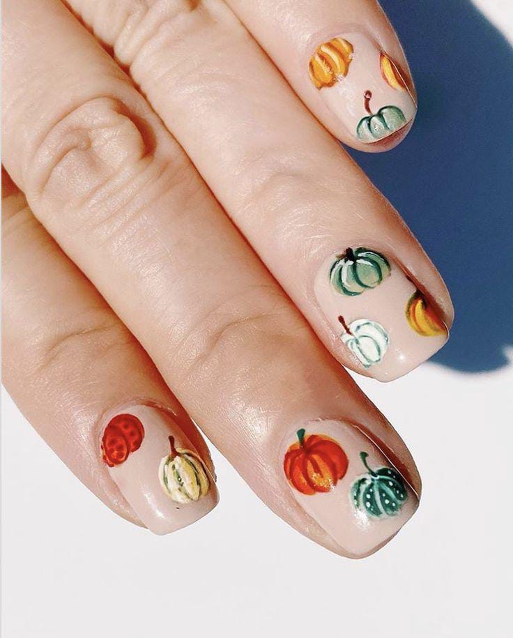 This design captures the cozy vibe of November with playful mini pumpkins in shades of orange, green, and cream painted over a soft nude base.