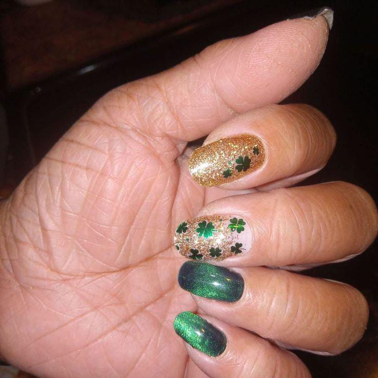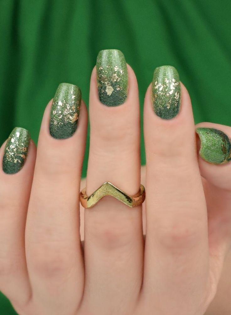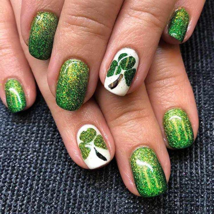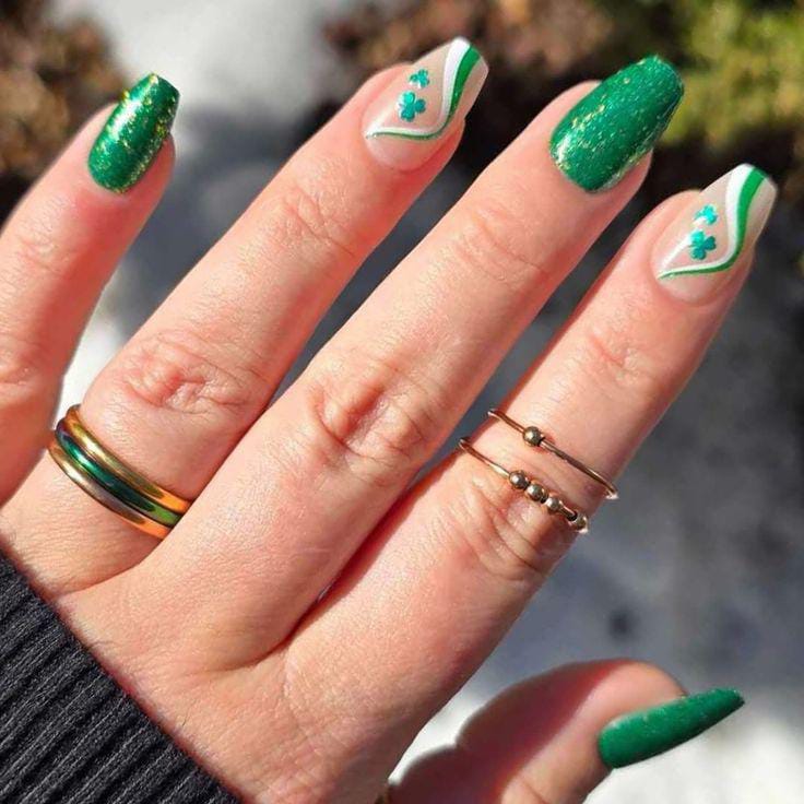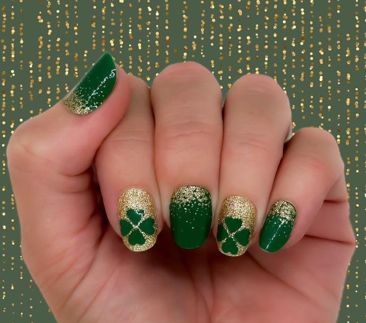 Deep green glitter fades into lighter tones, topped with hints of gold foil for a rich, sparkling effect. The overall style feels bold and glamorous while still keeping a classy St. Patrick’s Day theme.