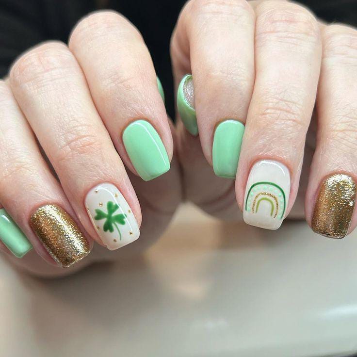 This design pairs soft mint green nails with shimmering gold accents for a fresh, classy look. Subtle shamrocks, dots and a delicate rainbow detail on the cream base add a festive St. Patrick’s Day touch without overpowering the clean, elegant vibe.