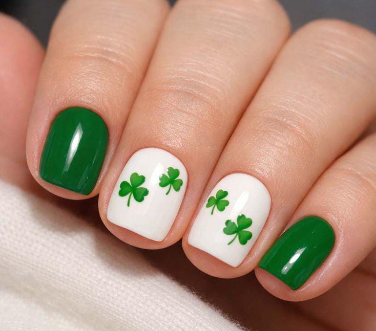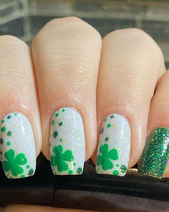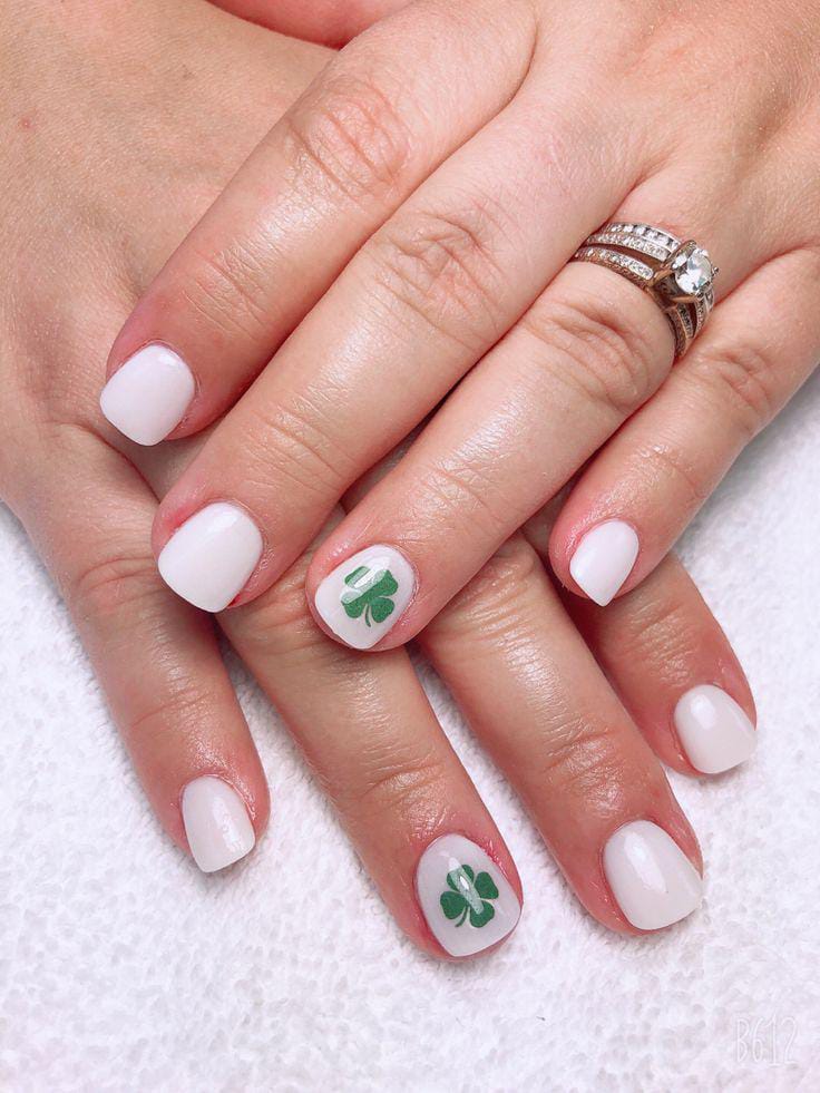This clean white manicure keeps things simple with small green shamrock accents on select nails. The overall look is fresh, subtle, and effortlessly classy — perfect for a minimalist St. Patrick’s Day style.