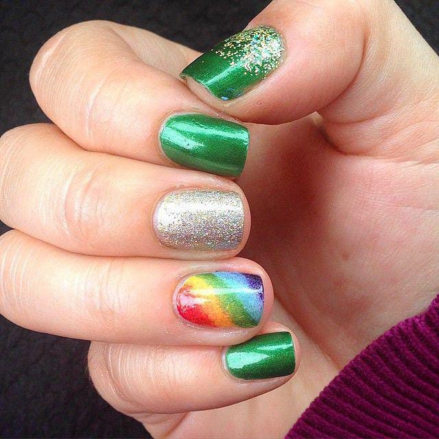 Glossy deep green nails are paired with a sparkling gold accent and a colorful rainbow feature nail. The overall style is simple and classy, with just enough festive flair to celebrate St. Patrick’s Day beautifully.
