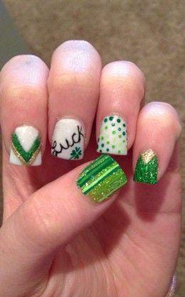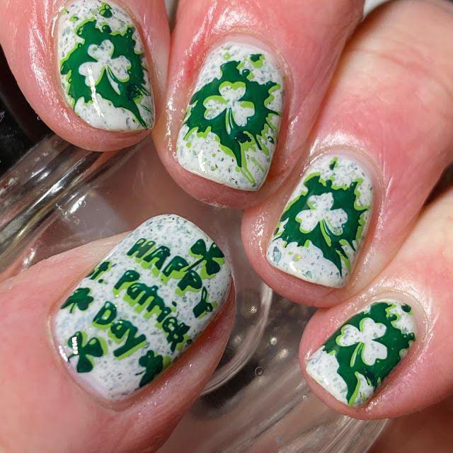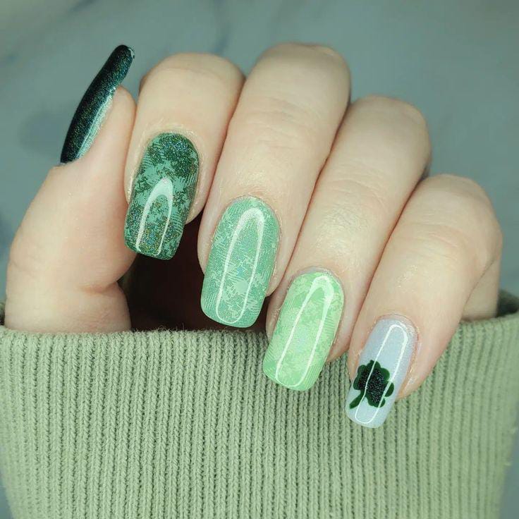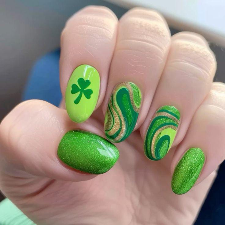 A vibrant mix of lime and deep green shades creates a playful yet polished look. The swirling patterns and simple clover accent give it a modern, classy St. Patrick’s Day vibe.