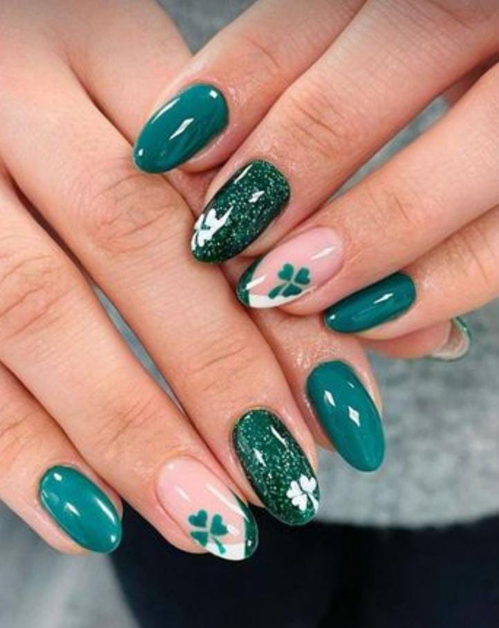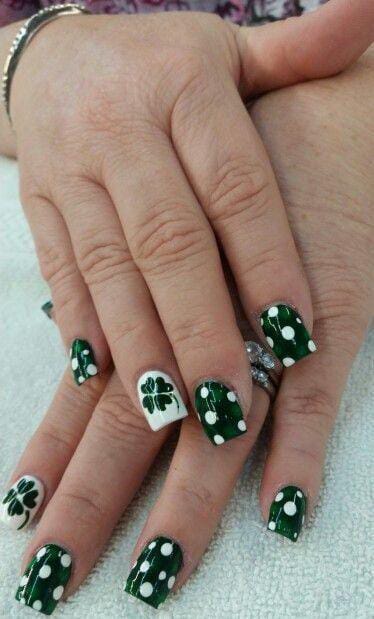Rich emerald green nails are balanced with cream white accent nails featuring shamrocks and gold polka dot details. The mix of glossy green and full gold glitter creates a bold yet polished St. Patrick’s holiday statement.