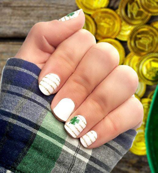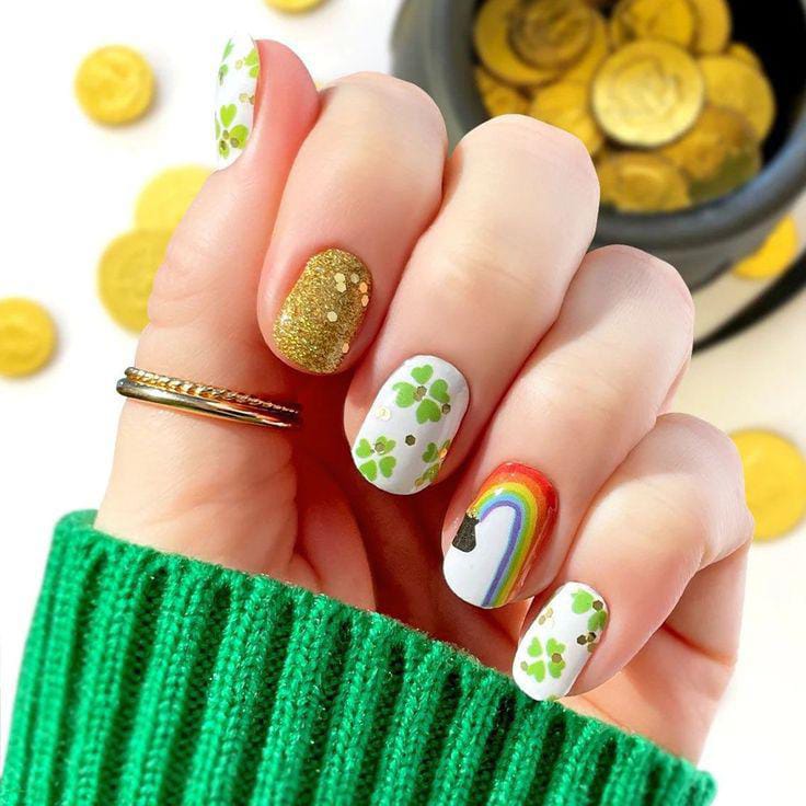 A bright combination of gold glitter, crisp white, and green clover accents creates a lively holiday feel. The rainbow detail adds a whimsical touch, while the overall look remains classy and stylish St. Patrick’s day.