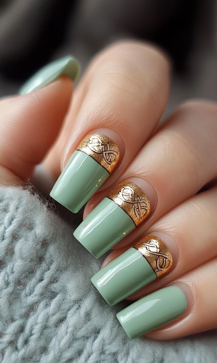This design features soft sage green paired with a rich metallic gold accent near the cuticle. Delicate Celtic-inspired details add an elegant, heritage touch, giving the manicure a refined and festive vibe perfect for a classy St. Patrick’s Day look.