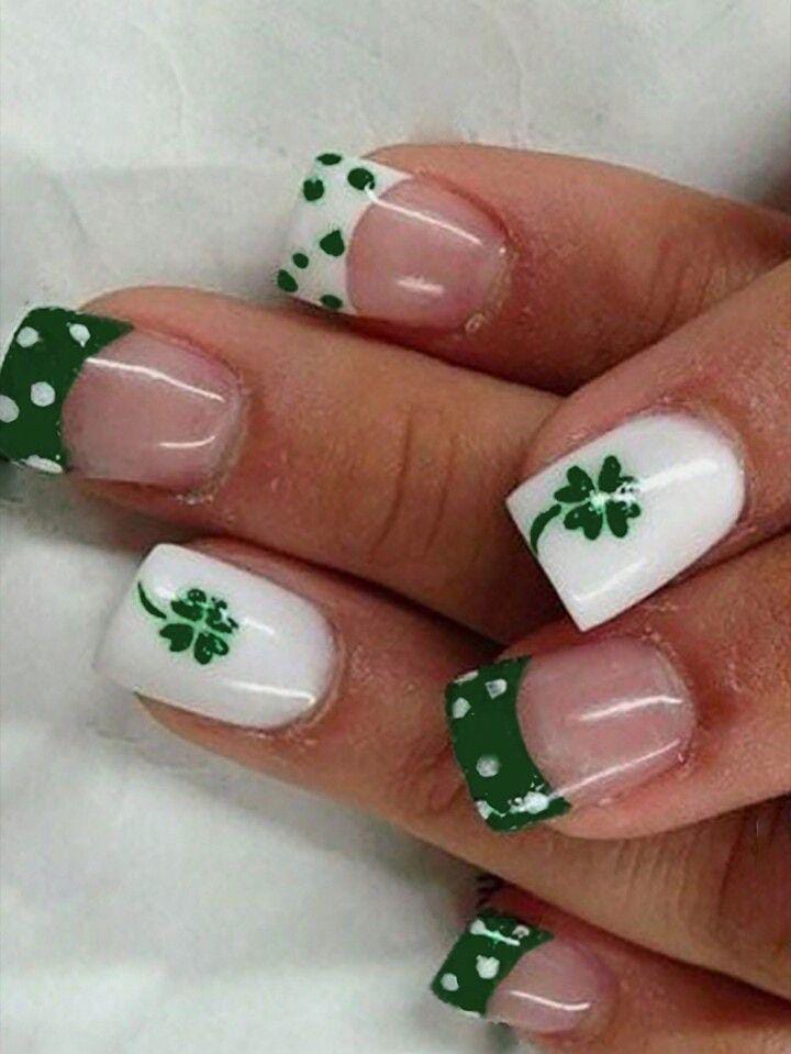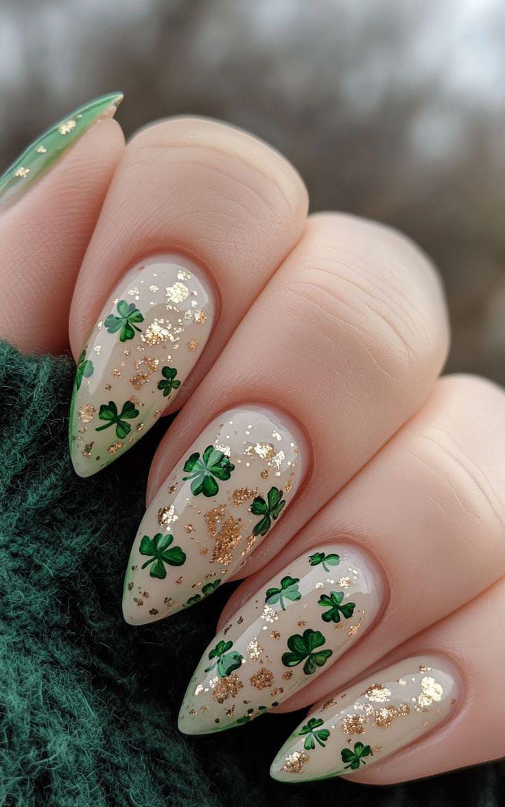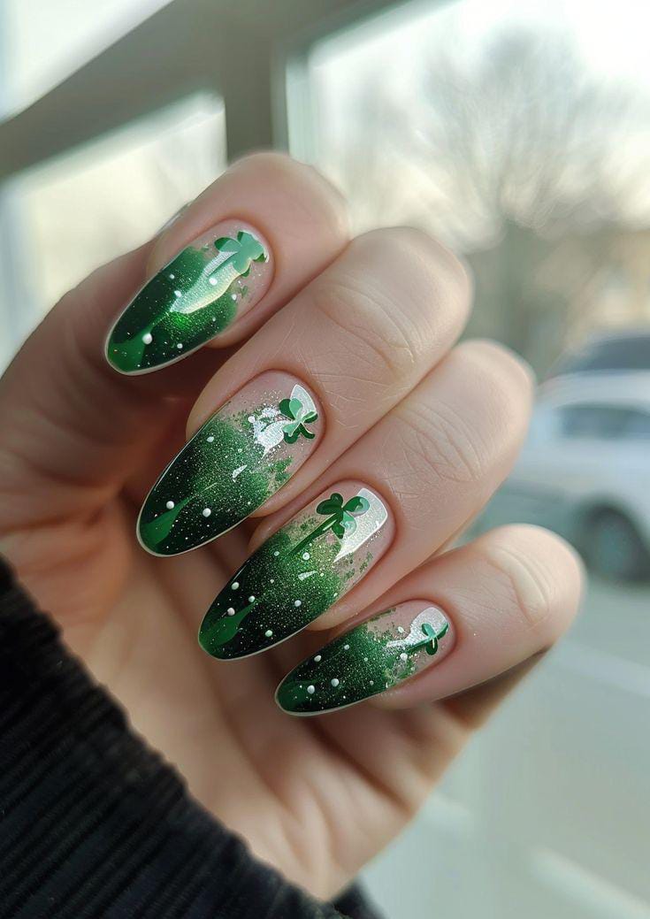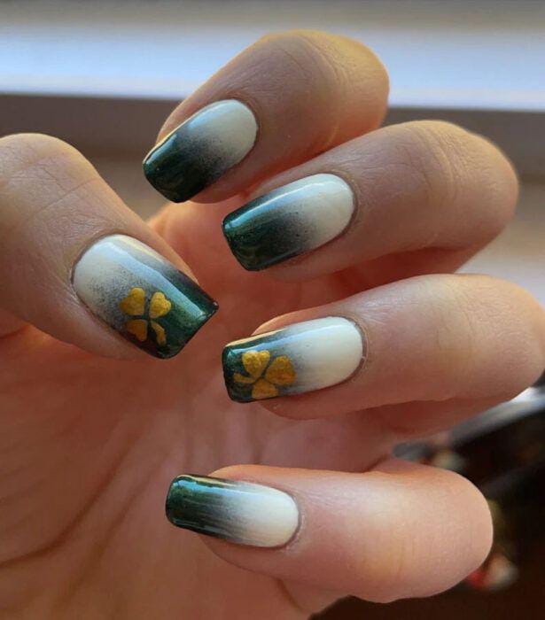 This design features a deep green-to-white ombré fade with delicate gold shamrock accents. The blend of rich emerald tones and soft neutrals gives it a classy, slightly glamorous St. Patrick’s Day vibe.