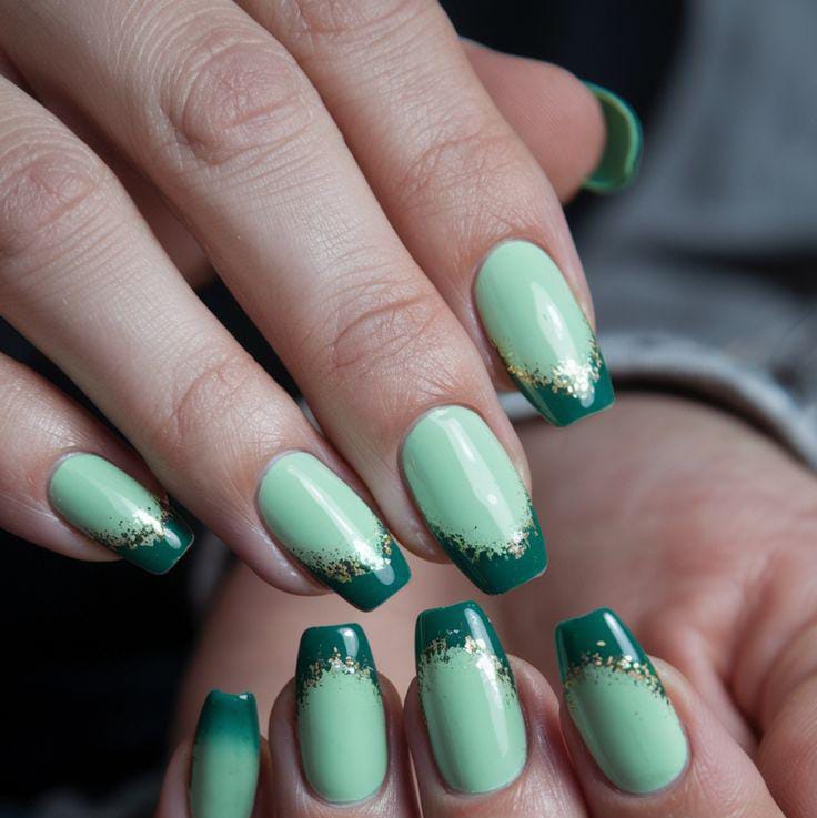 Soft mint green and deeper emerald tip nails with a dusting of gold shimmer across the tips. The gradient effect feels modern and chic, offering a stylish and classy nod to St. Patrick’s Day.