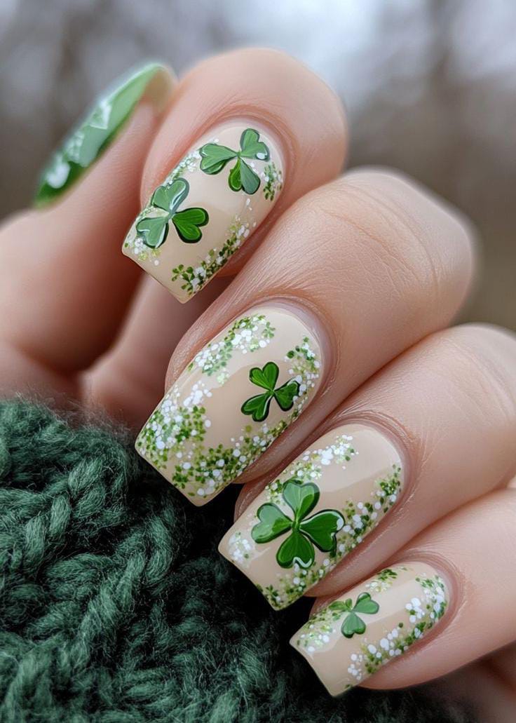 A soft nude-to-green glitter ombré creates a dreamy, blended effect. Small shamrock accents and speckled details make this design St. Patrick’s Day is festive while still looking classy.