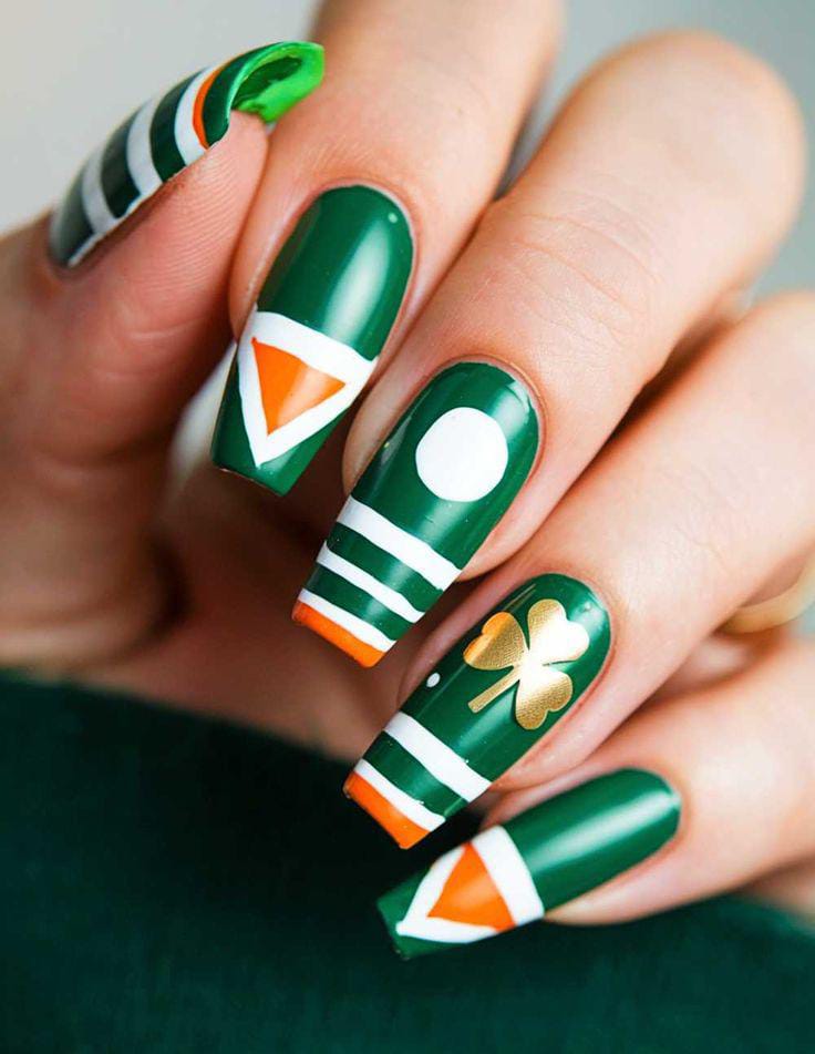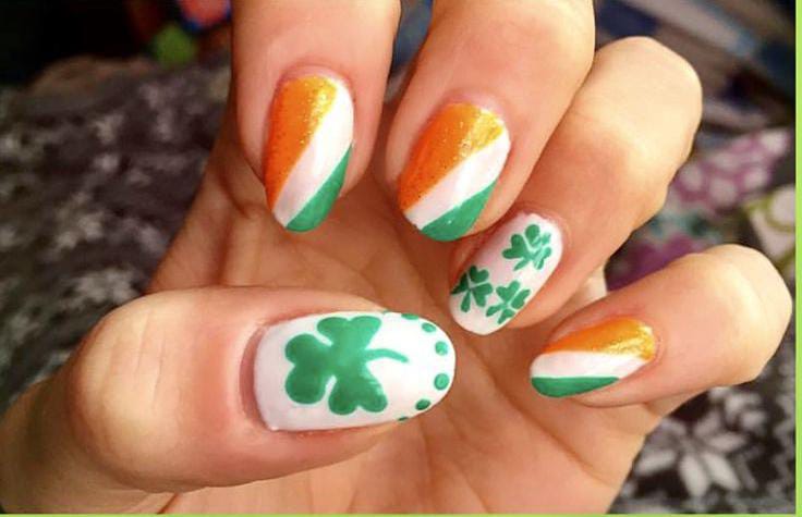 This classy St. Patrick’s Day nail design mixes soft green, white strips, and warm gold-orange glitter tones mimicking the Irish flag for a festive but elegant look. The subtle shimmer and shamrock accents give it a polished, celebratory vibe without feeling over-the-top.