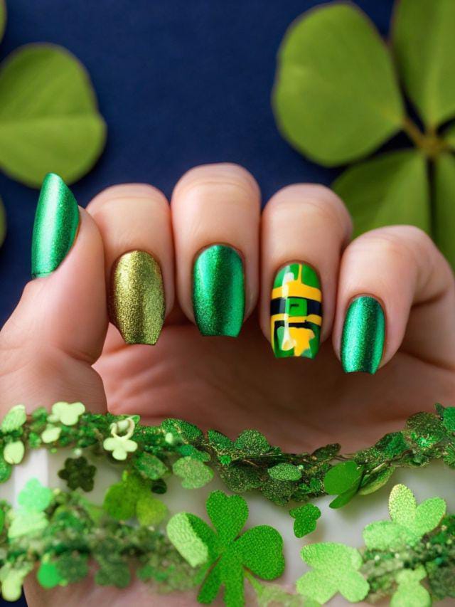 Rich metallic green shades take center stage in this bold yet elegant design. With sleek finishes and a subtle nod to Irish-inspired colors, it delivers a glamorous and classy St. Patrick’s Day statement.
