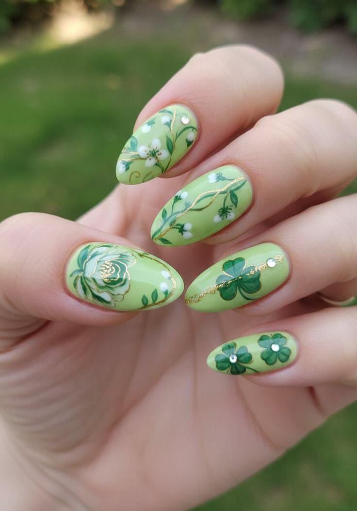 This soft mint green set is decorated with delicate clover, subtle gold lines and rhinestone and floral artwork. The look feels fresh, feminine, and perfect for a classy spring-inspired St. Patrick’s Day style.