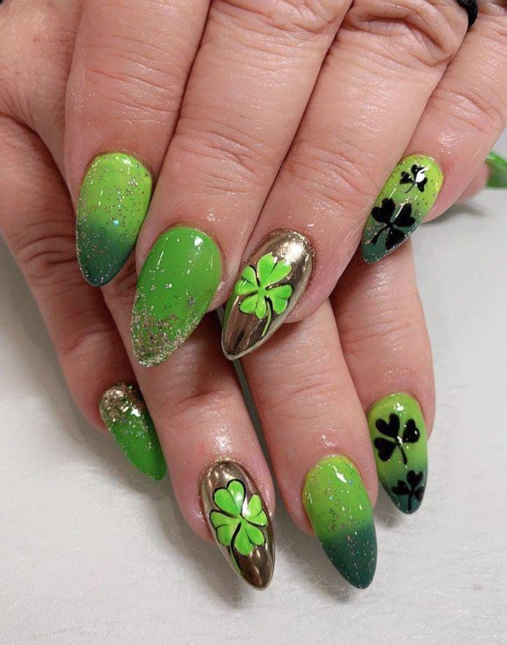 A bright lime-to-green glitter ombre gradient pairs beautifully with metallic gold and black shamrock details. The mix of shimmer, chrome, and bold clover art gives this design a glamorous yet festive St. Patrick’s Day finished.