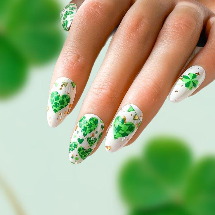 A creamy white base sets the stage for playful green hearts, gold foil touches and shamrock accent nails. The mix of bright greens and tiny gold flecks creates a fun, cheerful design with a sweet St. Patrick’s holiday touch.