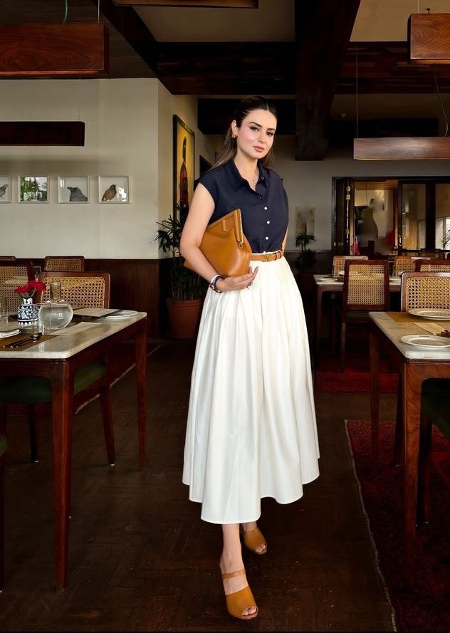 Clean, tailored, and quietly elevated. A crisp navy sleeveless shirt tucked into a flowing ivory midi skirt creates that effortless contrast that always works.