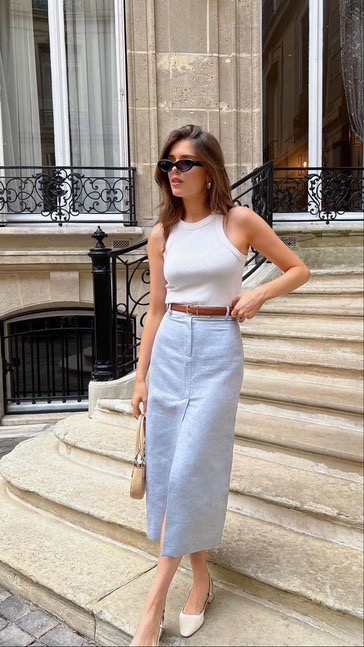 Simple pieces, done right. A fitted ribbed tank tucked into a soft grey midi skirt gives that clean, easy silhouette that always feels elevated.