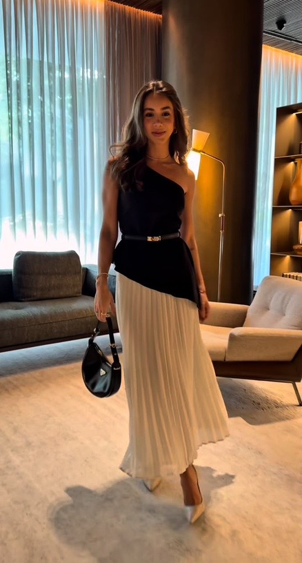 There’s a quiet confidence in the way deep black meets soft ivory, creating a look that feels both bold and serene. The fluid trousers move with ease, while the halter neckline adds a touch of sculpted elegance. Minimal accessories keep the focus on clean lines, letting the entire outfit feel calm, powerful, and effortlessly refined.