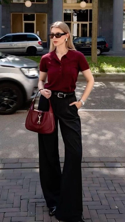 Rich burgundy brings depth to this sharply tailored ensemble, offering a refined alternative to classic neutrals. The fitted polo knit tucks seamlessly into high-waisted black trousers, creating a long, streamlined line. Coordinated accessories echo the deep tone, adding cohesion without excess. Sleek, confident, and quietly striking—this look captures modern elegance with a subtle edge.