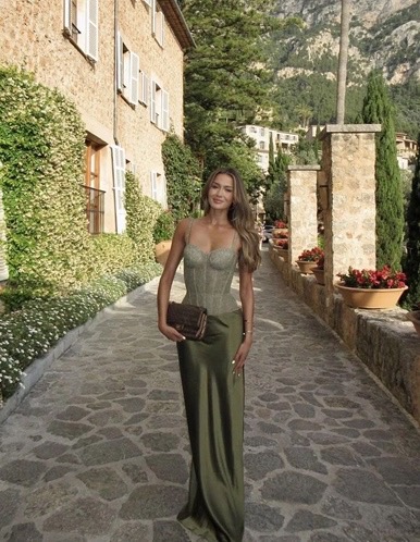 Structured corset-style top defines the upper frame with precision. Fluid satin skirt falls straight, creating a long, uninterrupted line. Muted olive tones keep the palette cohesive. A compact clutch adds balance without distraction. Clean, controlled, and sharply elegant.