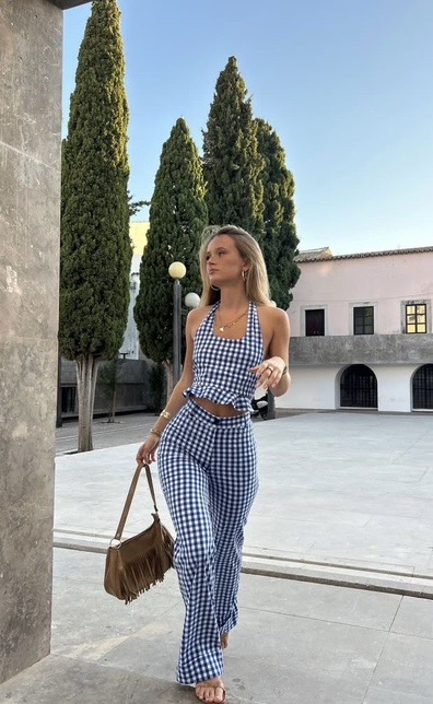 A fresh take on warm-weather tailoring, this gingham set blends playful pattern with a sleek, body-contouring fit. The halter-style top sharpens the neckline while flared trousers elongate the frame with effortless movement. Earthy accessories introduce warmth and texture, balancing the crisp print. Polished yet relaxed, this look captures a refined coastal mood with modern clarity.