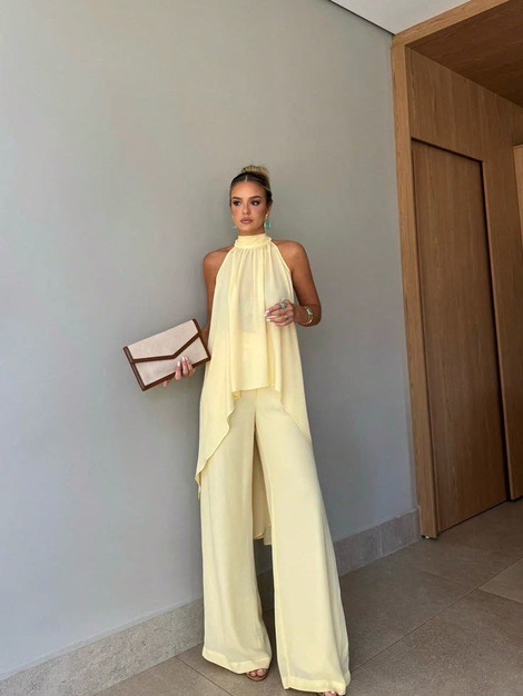 Fluid tailoring takes center stage in this soft buttercream ensemble, where a draped halter top cascades effortlessly over wide-leg trousers. The elongated silhouette feels airy yet composed, striking a balance between movement and structure. Minimal accessories keep the focus on the fabric’s graceful flow, resulting in a look that feels quietly luxurious and impeccably refined for warm-weather elegance.