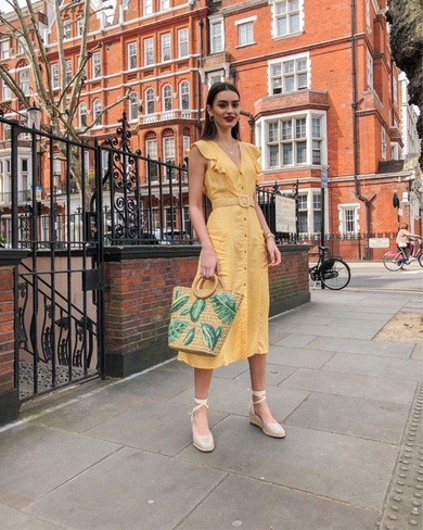 Soft yellow just feels right in the sun. The button-front midi with delicate texture keeps things light and feminine without trying too hard. Woven bag and neutral heels add that perfect summery touch. Easy, pretty, and ideal for slow days out or casual plans that still need a little polish.