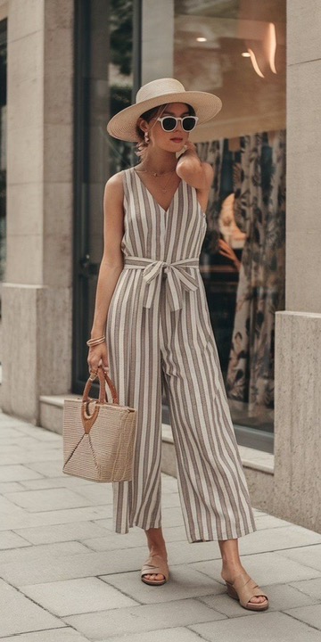 Vertical stripes meet relaxed tailoring in this effortlessly refined jumpsuit, designed to elongate and streamline the silhouette. The belted waist adds subtle structure, while the airy fabric keeps the look light and breathable. Paired with woven textures and neutral sandals, it captures a polished yet laid-back elegance perfect for warm, sunlit days.