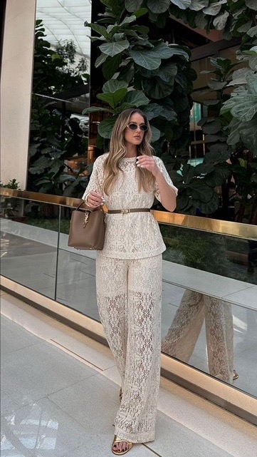 All-over lace, but make it wearable. The matching top and wide-leg pants feel soft, light, and effortlessly put together. A slim belt adds just enough shape, while neutral accessories keep everything calm and polished. Easy, breezy, and perfect for those days when you want something pretty without overthinking it.