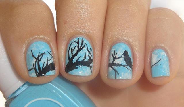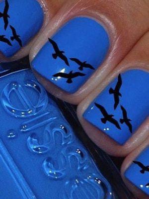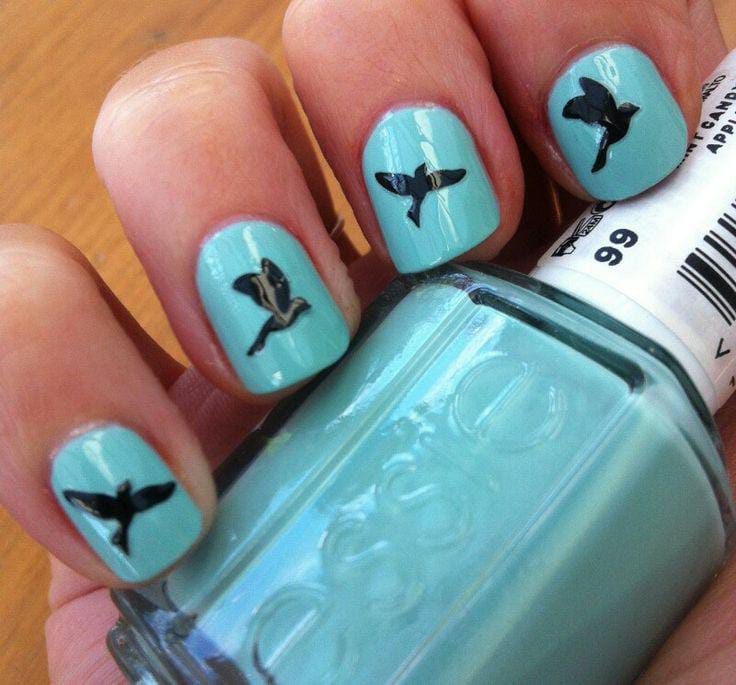 Soft aqua nails featuring simple black crows silhouettes, creating a fresh and airy look.