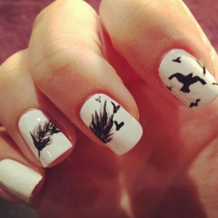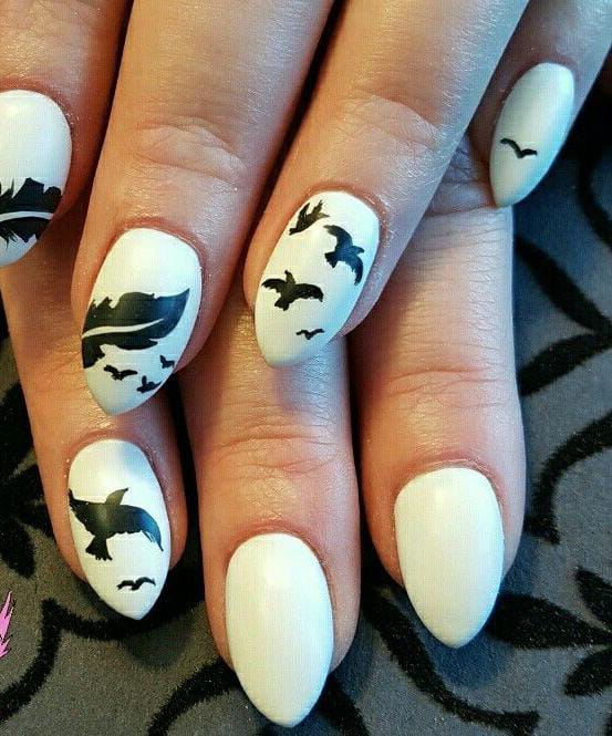 White nails decorated with black feather and flying crow motifs, symbolizing movement and freedom.