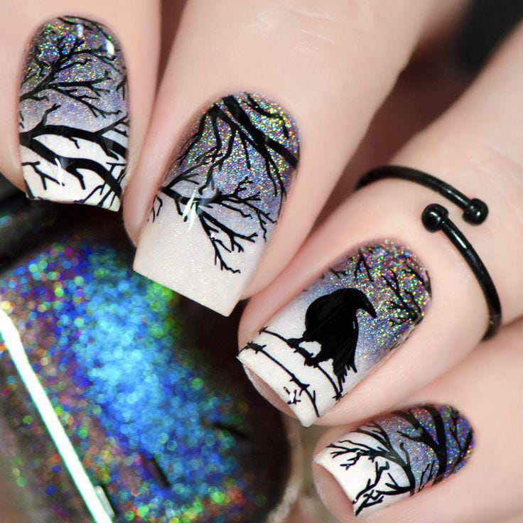 Dark, glittery ombré nails with black tree branches and a perched crow for a mysterious, night-sky vibe.