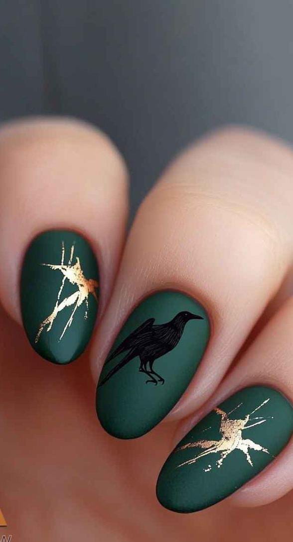 Deep green matte nails accented with gold streaks and a detailed black crow, combining elegance with edge.