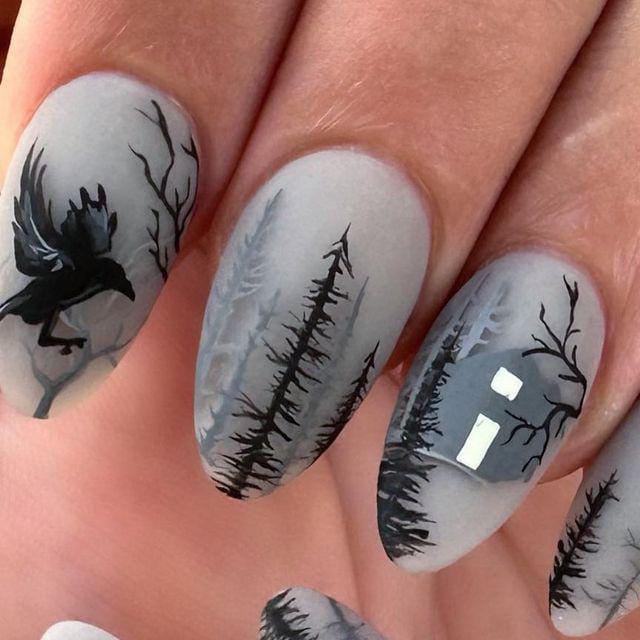 Smoky gray nails with eerie forest silhouettes, a house and a flying crow, evoking a misty, haunted forest feel.