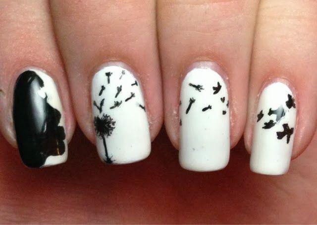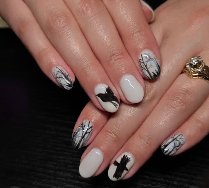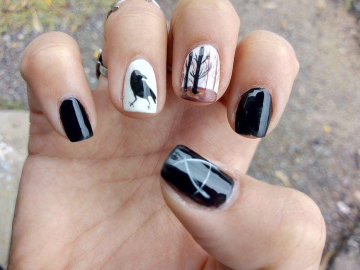 A mix of glossy black and white nails with crow and tree art, simple yet moody with a woodland atmosphere.