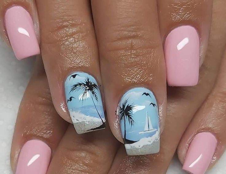 A beach-inspired scene with palm trees, ocean waves, and flying black birds in the sky, framed by pastel pink nails.