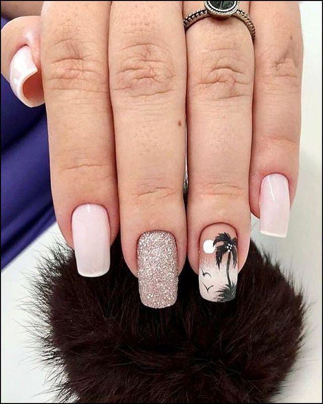 Nude and glitter nails highlighted with a palm tree and crow silhouette against a glowing moon, giving a serene night vibe.