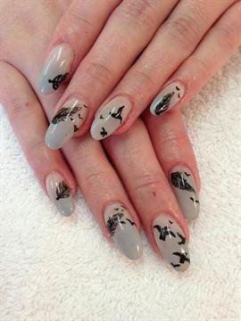 Muted grey nails with scattered crow silhouettes and feathers, creating a soft, moody, and artistic design.