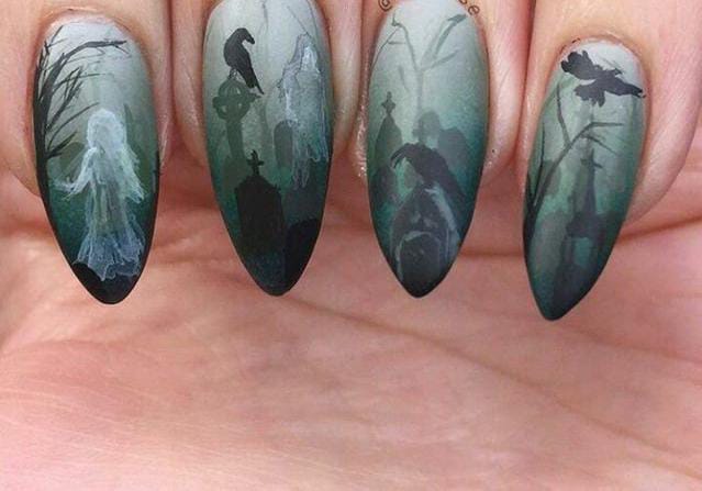 Dark green ombré nails with ghostly figures, tombstones, and crows, giving a spooky cemetery vibe.
